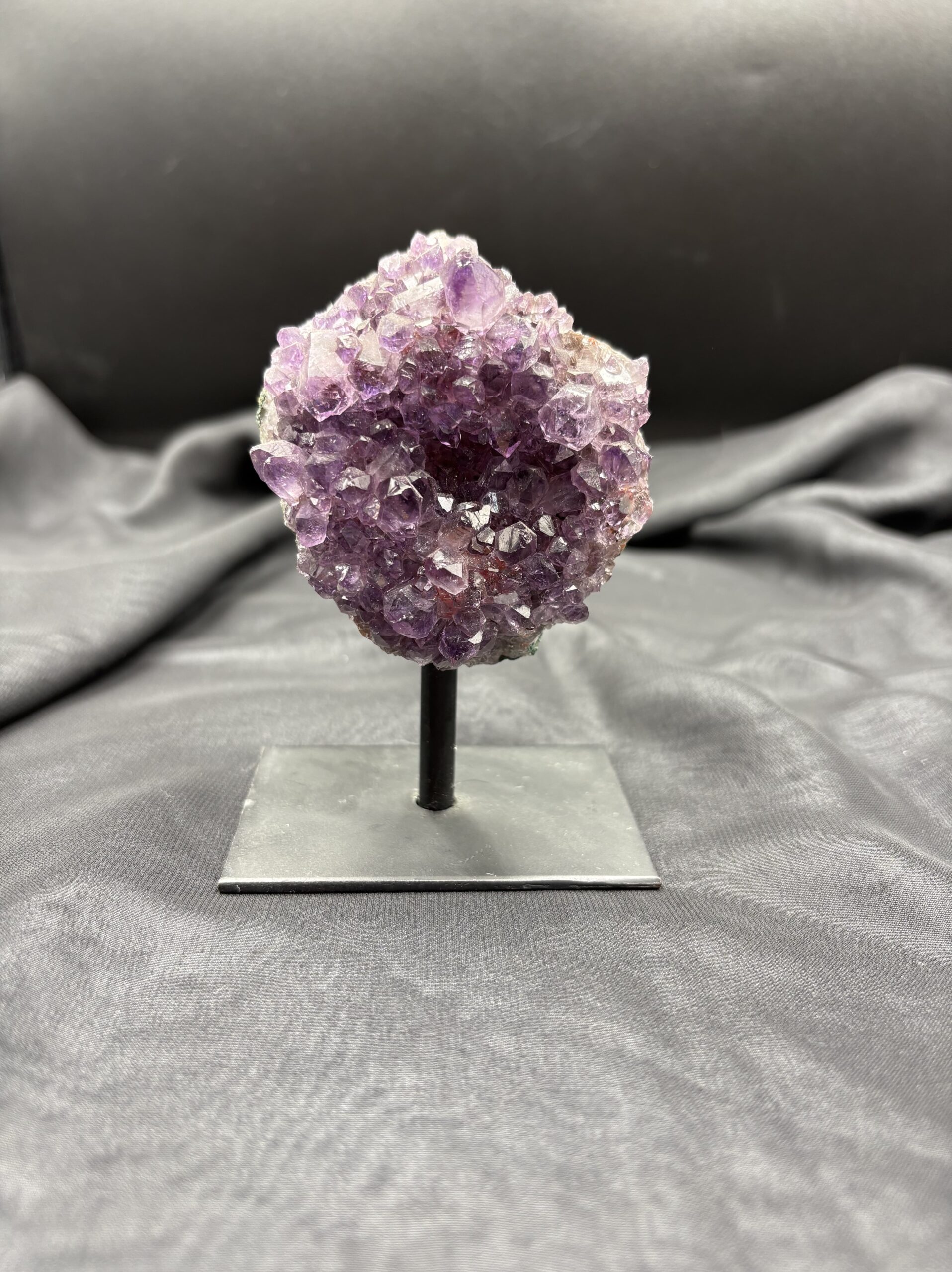 Ametist je kristal bogate ljubičaste boje, poznat po svojoj prirodnoj ljepoti i kristalnim vrhovima koji se formiraju u geodama i šupljinama stijena. Najčešće dolazi iz Brazila i Urugvaja. Postavljen na metalni stalak, ametist postaje upečatljiv dekorativni komad – spoj sirove prirode i elegancije. Svaki primjerak je jedinstven po obliku, intenzitetu boje i strukturi kristala. 💜✨