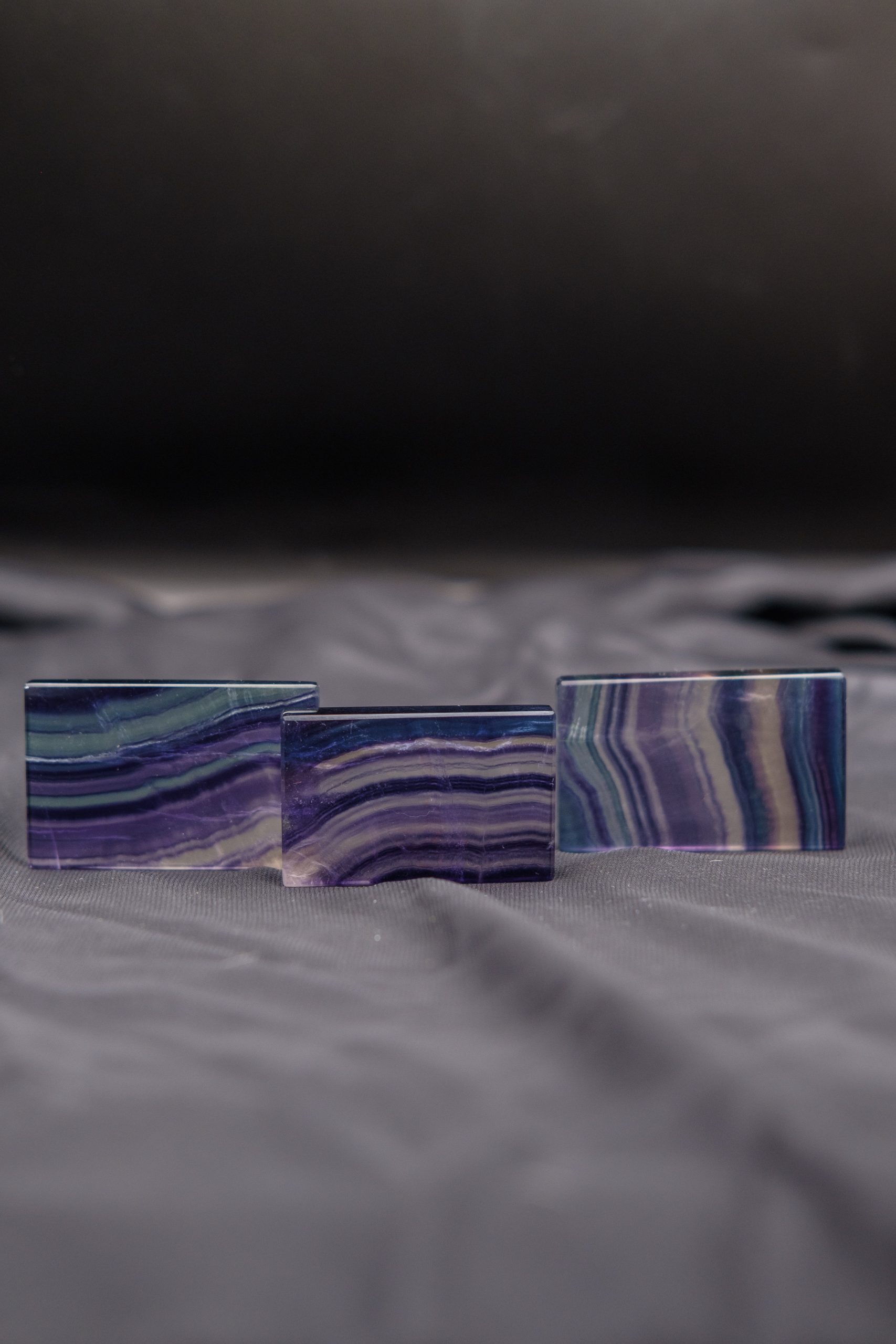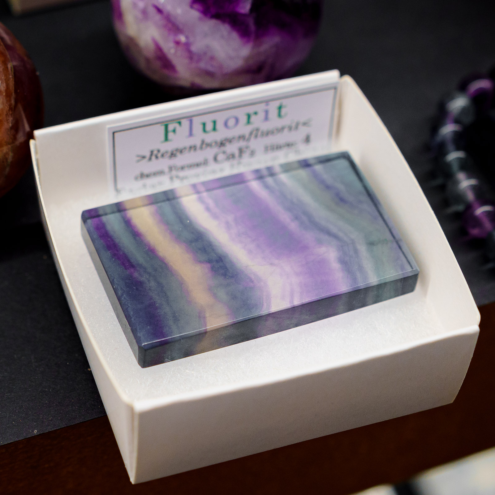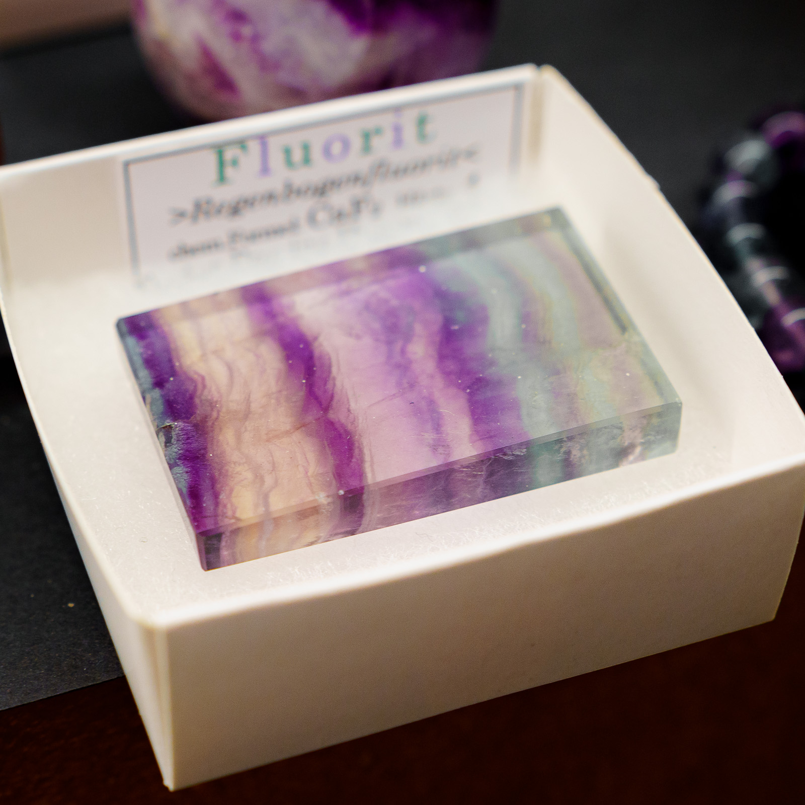 Pločica je ravno obrađena kako bi se istakli njen prirodni sjaj, pruge i prelivi boja – od intenzivnih ljubičastih i zelenih tonova do nježno plavkastih nijansi. Svaki komad je potpuno jedinstven; razlike u uzorcima, dubini boje i prozirnosti čine svaku fluoritsku pločicu AAA klase posebnim prirodnim dekorom i elegantnim dodatkom svakom prostoru.