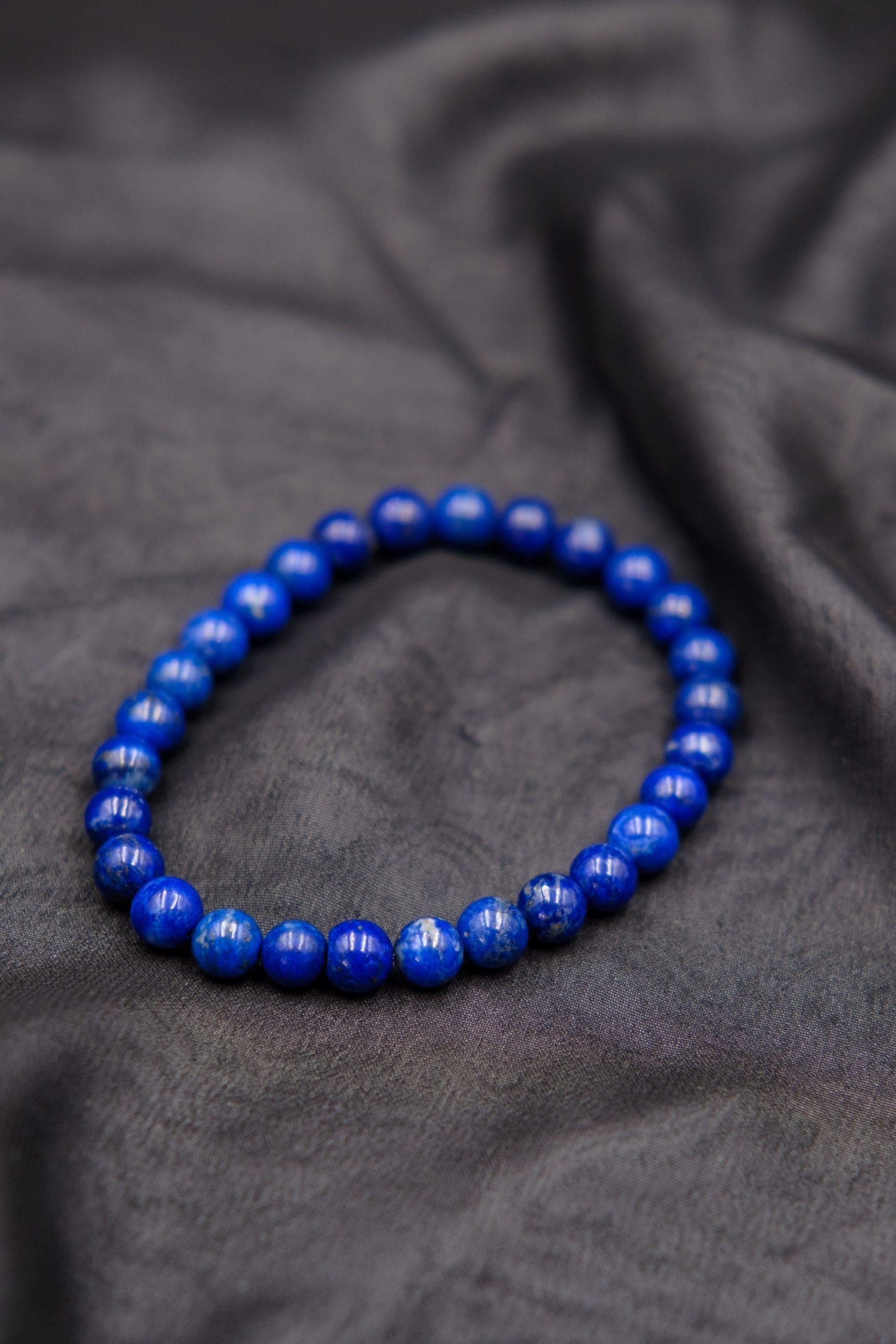Lapis lazuli narukvica izrađena je od prirodnog lapis lazulija, kamena poznatog po svojoj intenzivnoj plavoj boji i sitnim zlatnim piritnim inkluzijama koje mu daju prepoznatljiv sjaj. Mineral se formira u metamorfnim stijenama, a svaka kuglica narukvice nosi svoj jedinstveni uzorak i ton.
