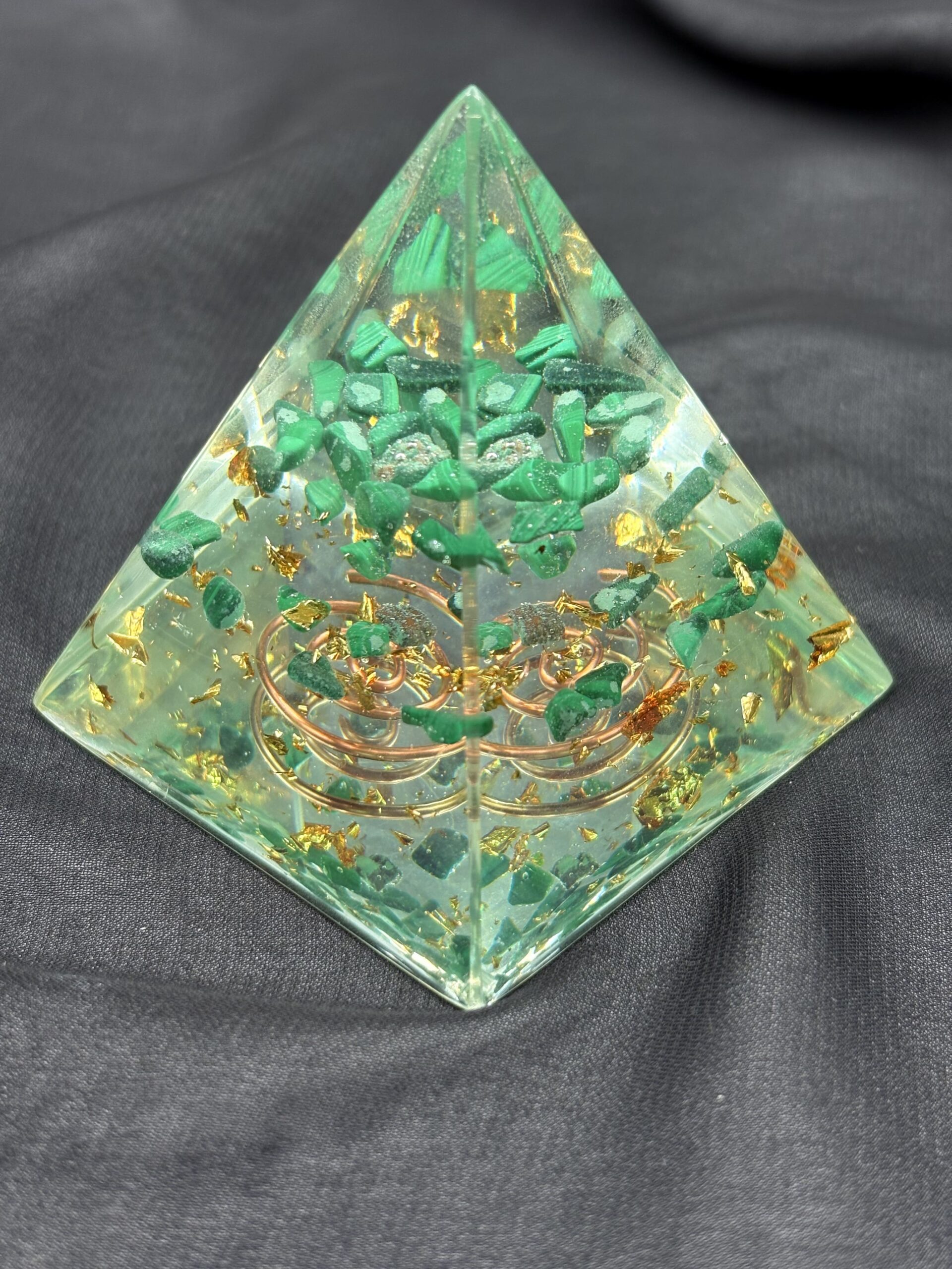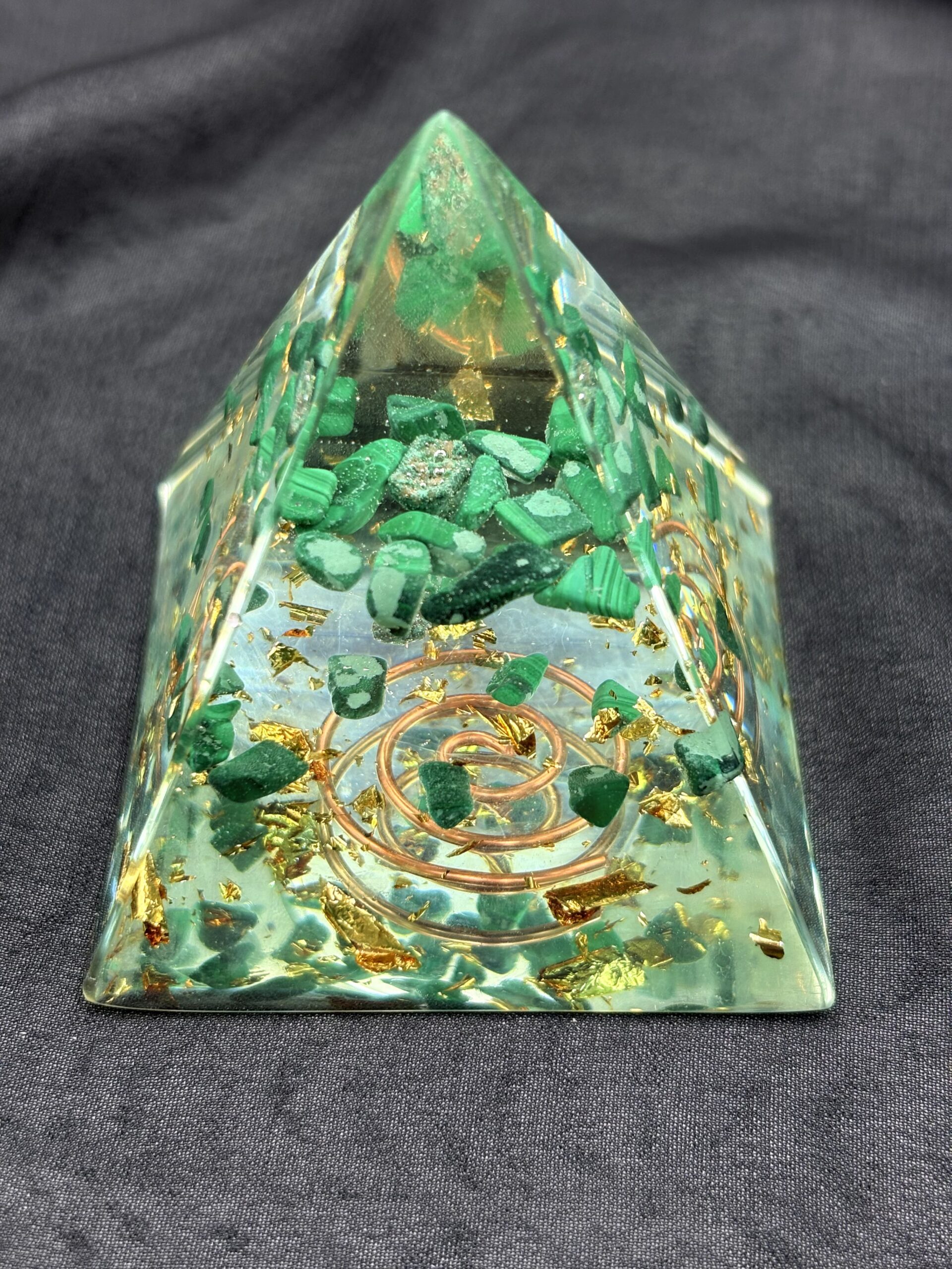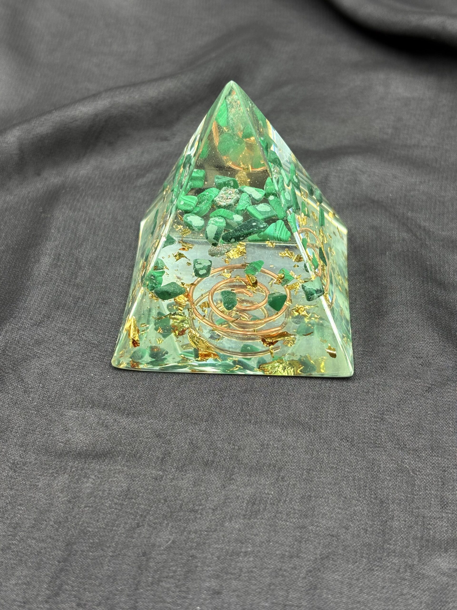 Ova piramida kombinira prirodni malahit s orgonit smjesom kristala i smole. Malahit, poznat po svojim dubokim zelenim šarama, dolazi iz rudnih područja Afrike i Južne Amerike. Njegove nijanse stvaraju upečatljiv kontrast unutar prozirne smole. Svaka piramida nosi svoju posebnu kombinaciju slojeva i boja.