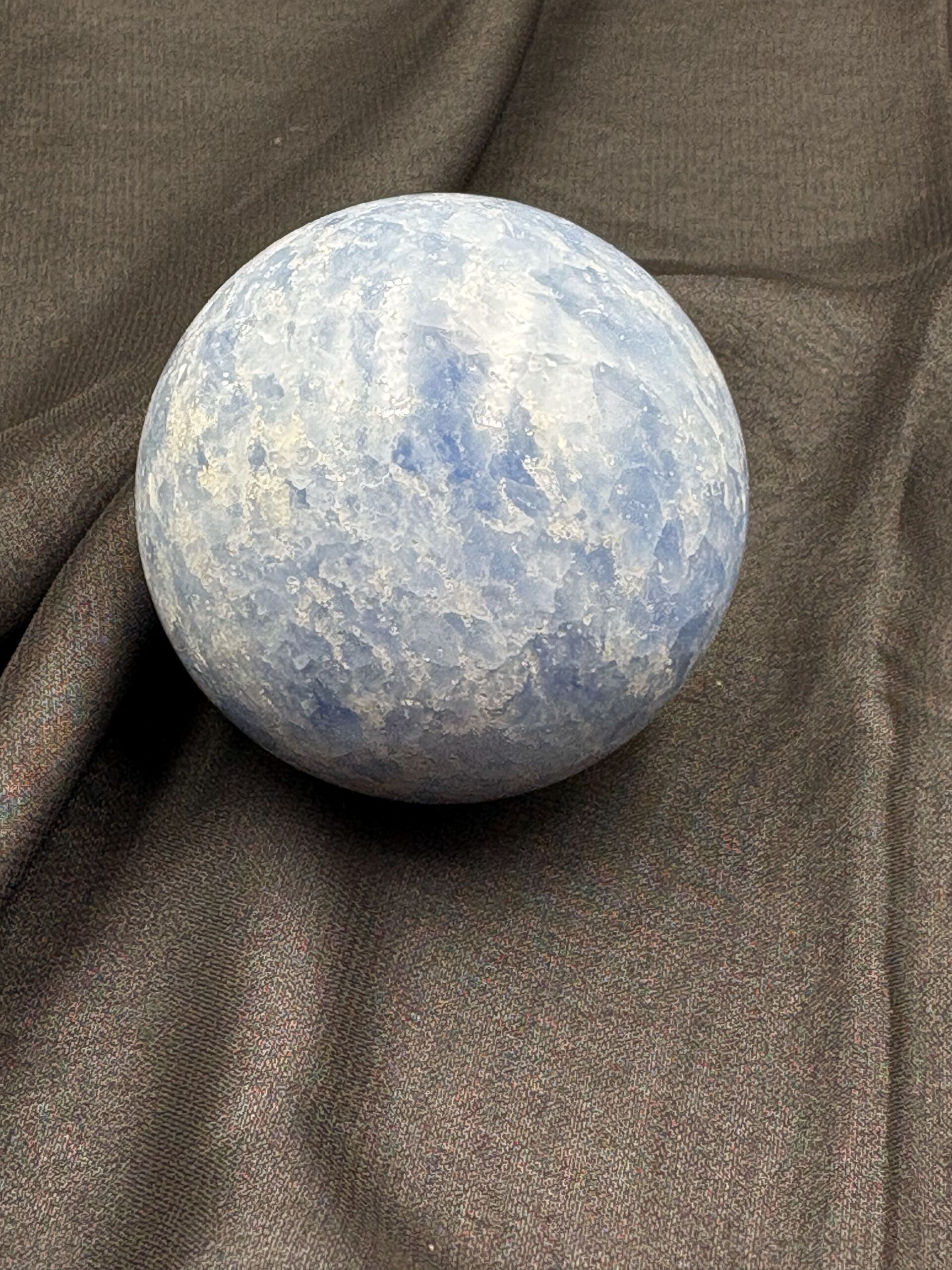 Plavi kalcit je nježni mineral svijetloplave boje, poznat po svojoj prozračnosti i blago staklastom sjaju. Nalazišta se uglavnom nalaze u Meksiku i Južnoj Americi. U obliku sfere, ovaj kamen pokazuje suptilne nijanse i prijelaze boje, stvarajući dojam smirenosti i lakoće. Svaka sfera ima prirodne varijacije koje je čine vizuelno laganom i ugodnom za oko.