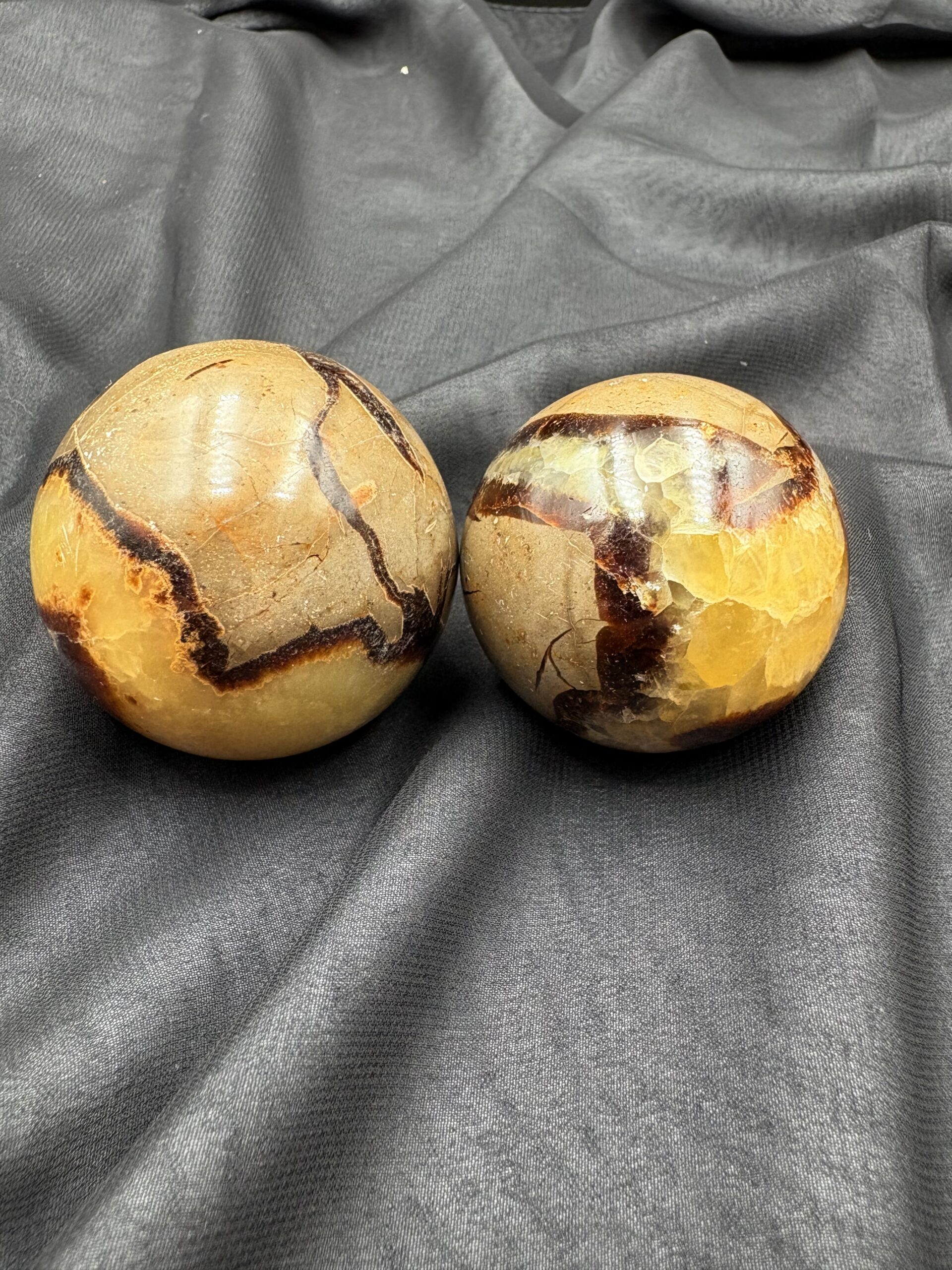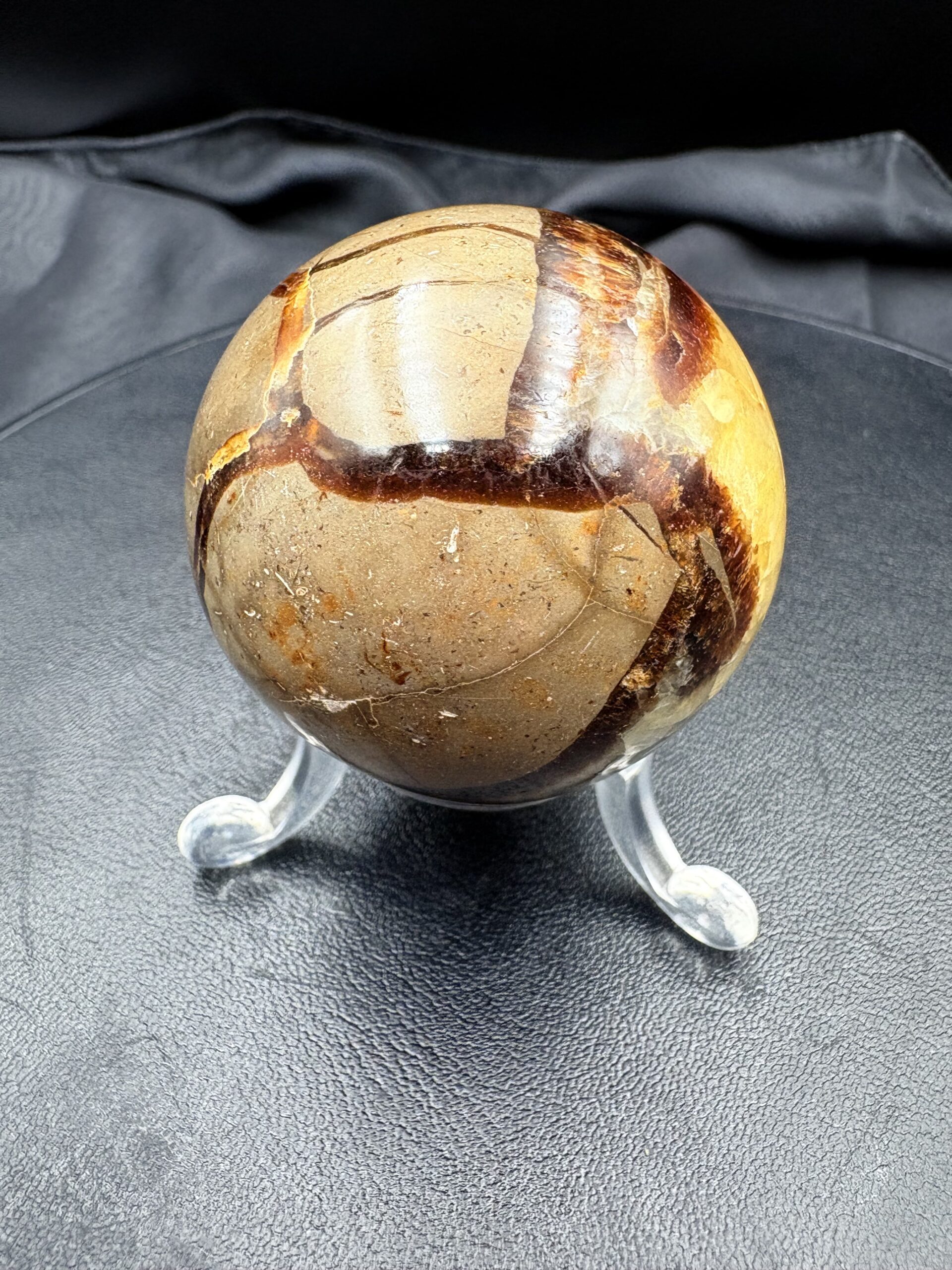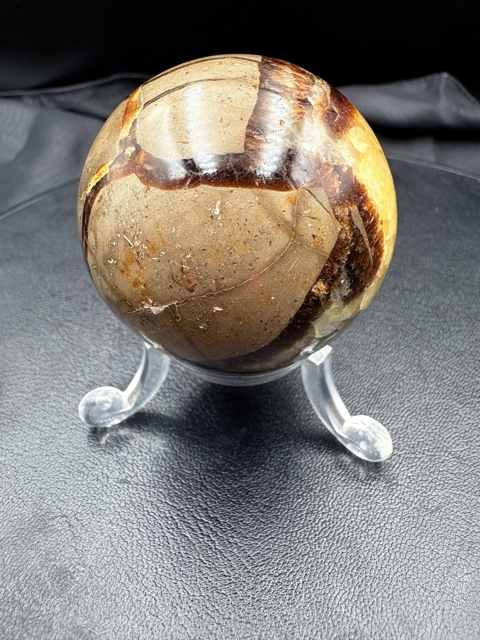 Septerijan, poznat i kao zmajevo kamenje, sastoji se od prirodne mješavine kalcita, aragonita i vapnenca, s karakterističnim uzorkom pukotina i kontrastnih tonova – žute, smeđe i sive. Nalazišta septerijana najčešće se nalaze u SAD-u i Madagaskaru. U obliku sfere, slojevi i linije ovog kamena stvaraju dinamičan, gotovo fosilan izgled koji svaku kuglu čini vizuelno bogatom i neponovljivom.